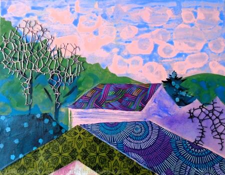 My current work has layers of acrylic paint and fabric collage. I love letting the drawing, painting and fabric have conversations with each other until the piece is done.
