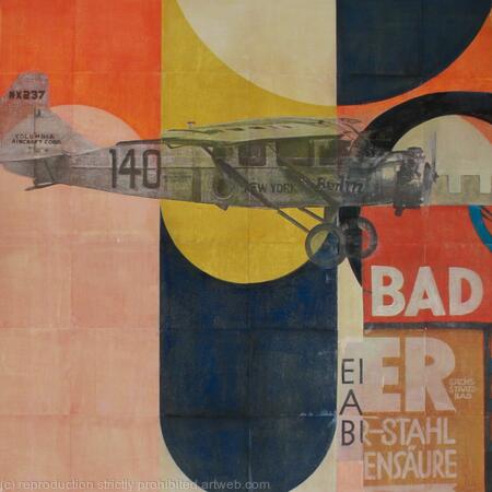 Her analog compositions combine acrylic paint and oil paint, original illustrations dating from 1900 till today and three dimensional recycled components.